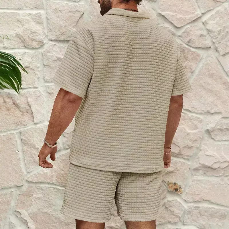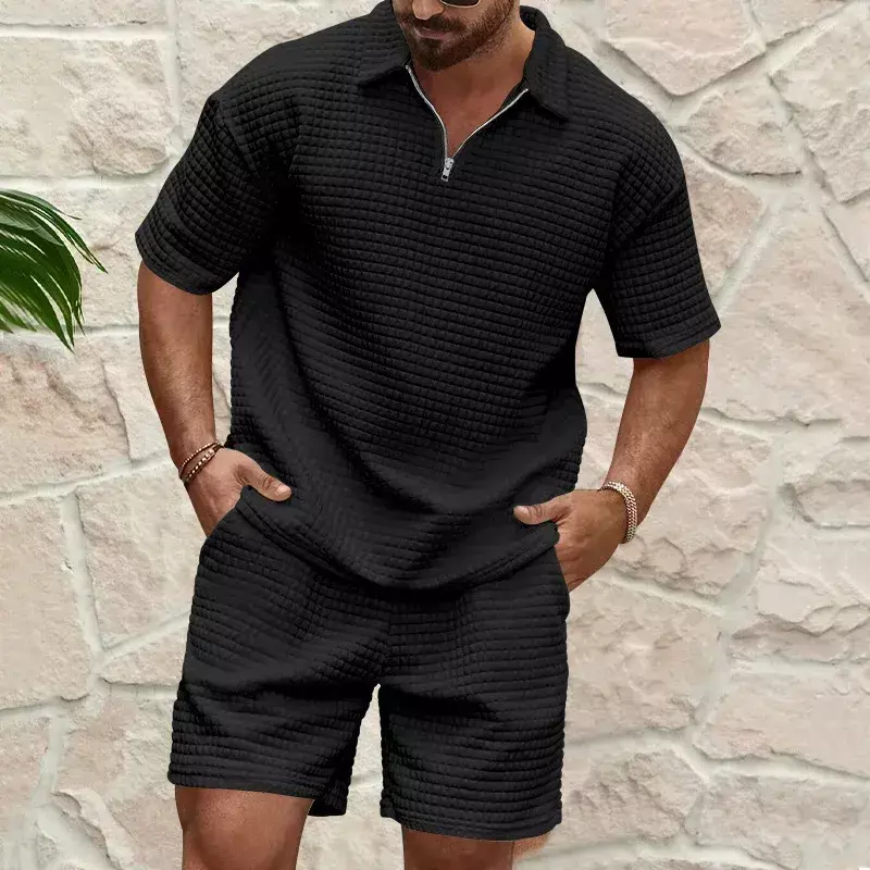 Conjunto masculino primavera/verão em estilo moderno e elegante, ideal para viagens e uso casual. Produzido em poliéster leve e confortável, oferece caimento certinho e visual atual. Possui camisa de colarinho entalhado com estampa xadrez e fechamento por zíper, combinada com shorts de braguilha, bolsos funcionais e acabamento de alta qualidade.