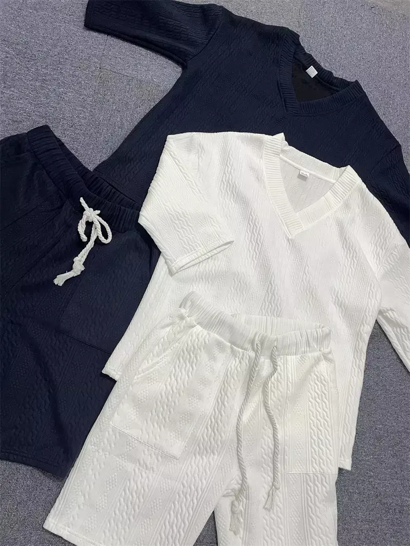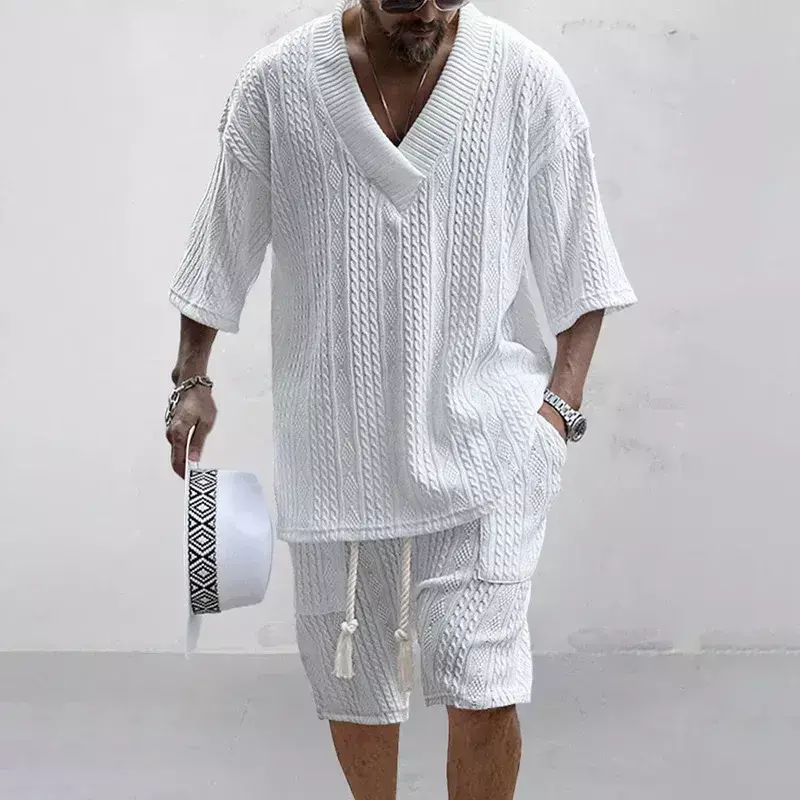 Conjunto masculino casual para o verão, ideal para uso diário. Produzido em poliéster leve, oferece conforto, respirabilidade e caimento padrão. A camiseta possui gola V, manga curta e modelagem sólida, enquanto o shorts conta com cordão de ajuste e bolsos funcionais.